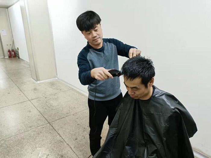 這一幕發生在11月21日公司中提車間。疫情阻擊戰開始至今已將近一月,為做好抗疫情保生產工作,公司采取了封閉式管理。500多名干部員工駐廠,堅守崗位,加班加點,維護了廠內良好的生產生活秩序。然而,封控近一個月,越來越多的人有了理發需求。尤其是男職工,一個個發壓眉、鬢過耳,凌亂而萎靡的樣子,讓人看在眼里急在心里。