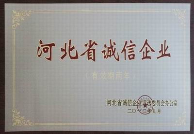 2012年9月26日上午,在河北省石家莊市召開了2012年“河北省企業誠信建設經驗交流會”暨“河北省誠信企業”授牌儀式。我公司被評為2012年“河北省誠信企業”,公司董事長、總經理王振剛被評為“河北省企業誠信建設優秀工作者”。河北省整頓和規范市場經濟秩序領導小組辦公室、河北省誠信企業評選委員辦公室、河北省企業家協會聯合對獲獎企業予以表彰,并頒發了證書。誠信是企業生存的根本,誠信是企業發展的法寶。