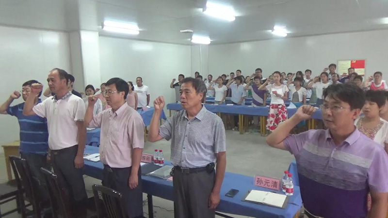 大會開始,全體黨員起立,高唱國歌,面對黨旗重溫誓詞莊嚴宣誓。